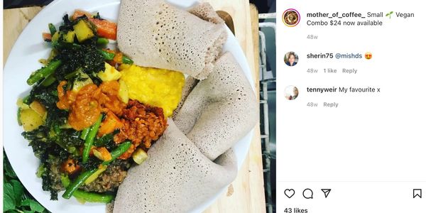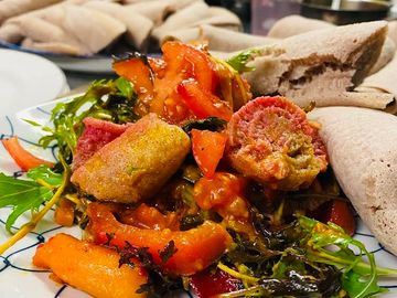Vegetables and small pieces of injera bread tossed in mothers sauces of spice berbere.