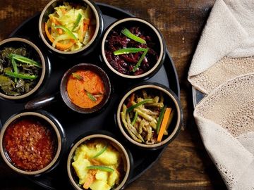 A shared meal platter made up of five portions of our best vegan Ethiopian dishes as well as our gluten free injera bread.