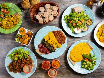 this shared meal offers another five of your favorite dishes including two servings of beef and lamb tibs as well as our gluten free injera bread